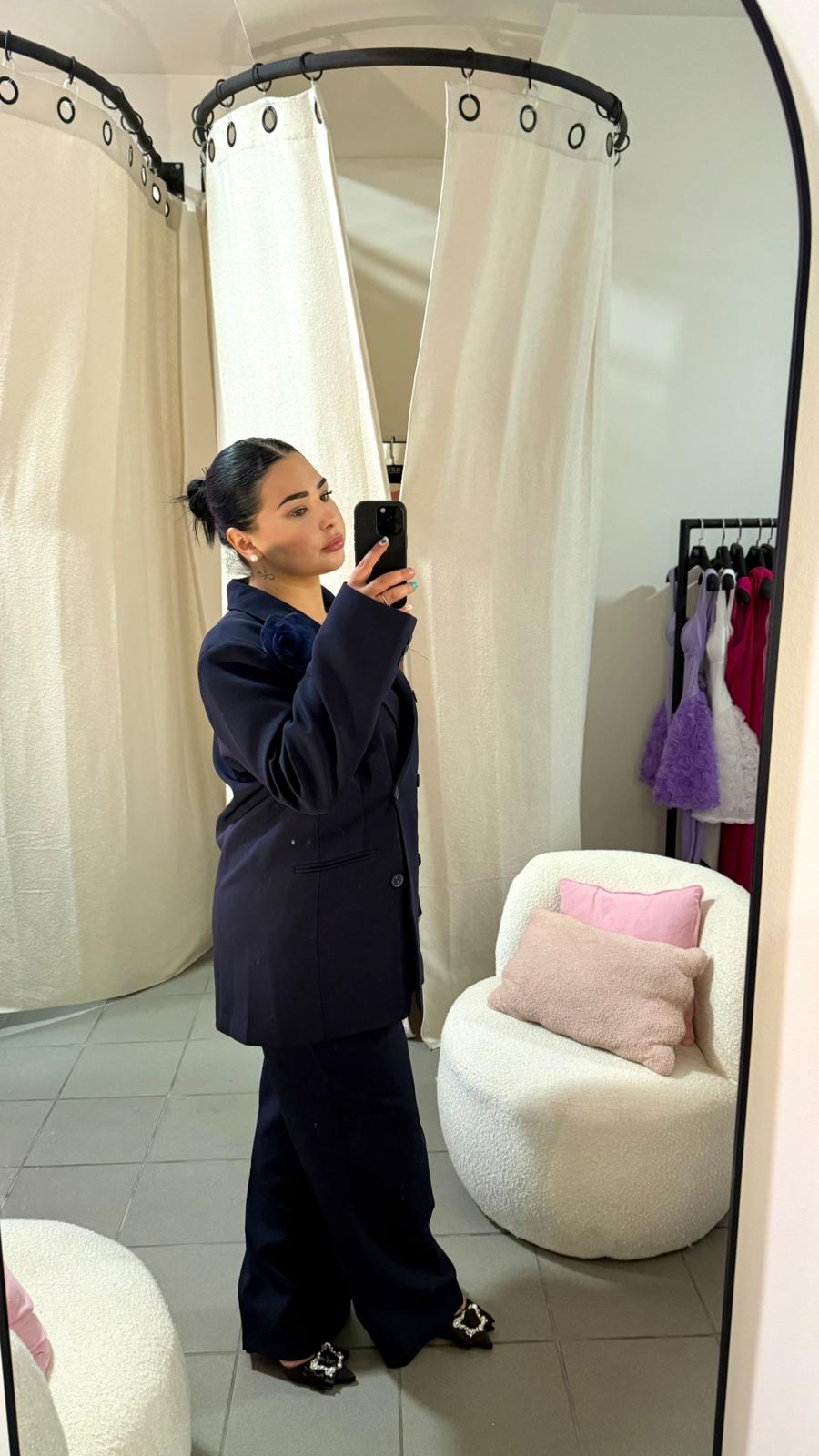 Acest costum bleumarin compus din blazer cambrat cu închidere dublă și pantaloni lungi cu croi drept emană eleganță și autoritate. Floarea detasabilă adaugă o notă feminină și sofisticată.