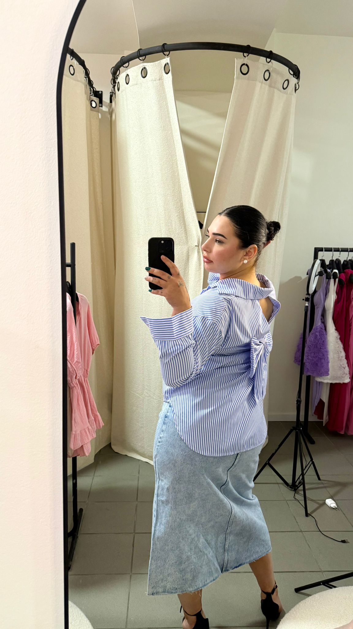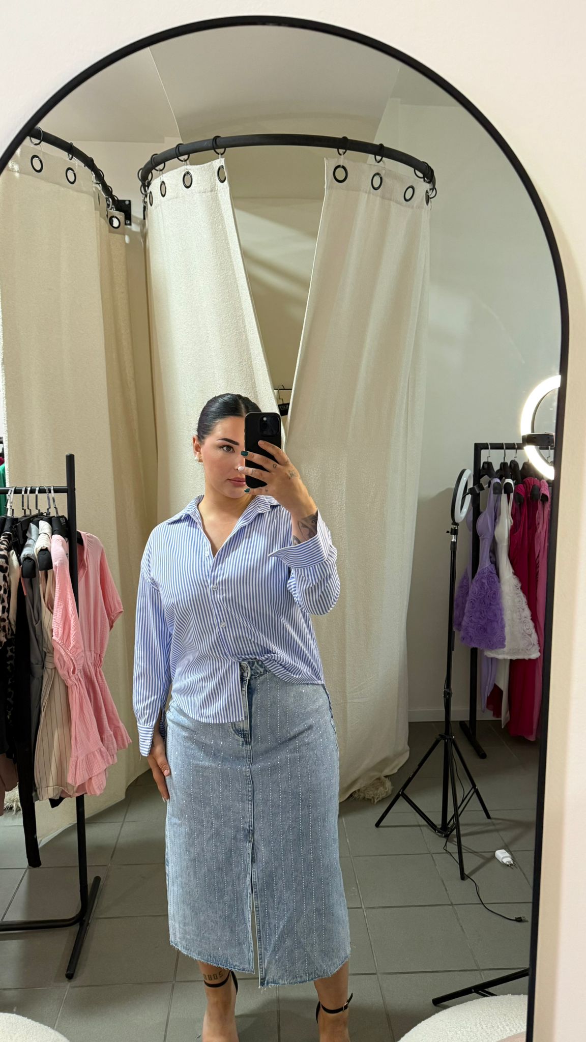 Ieși în evidență cu fusta noastră midi din denim decorată cu linii verticale de diamante subtile. Croiala dreaptă și șlițul frontal oferă libertate de mișcare și un look modern, în timp ce detaliile strălucitoare adaugă acel touch glam perfect pentru zi sau seară.