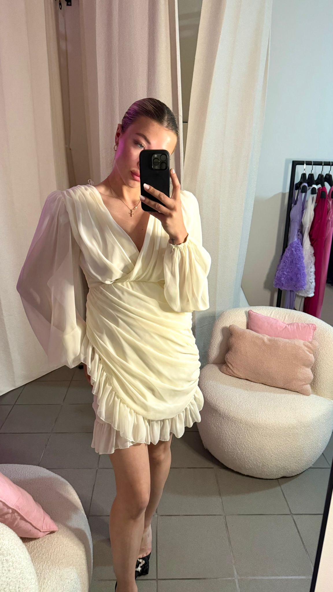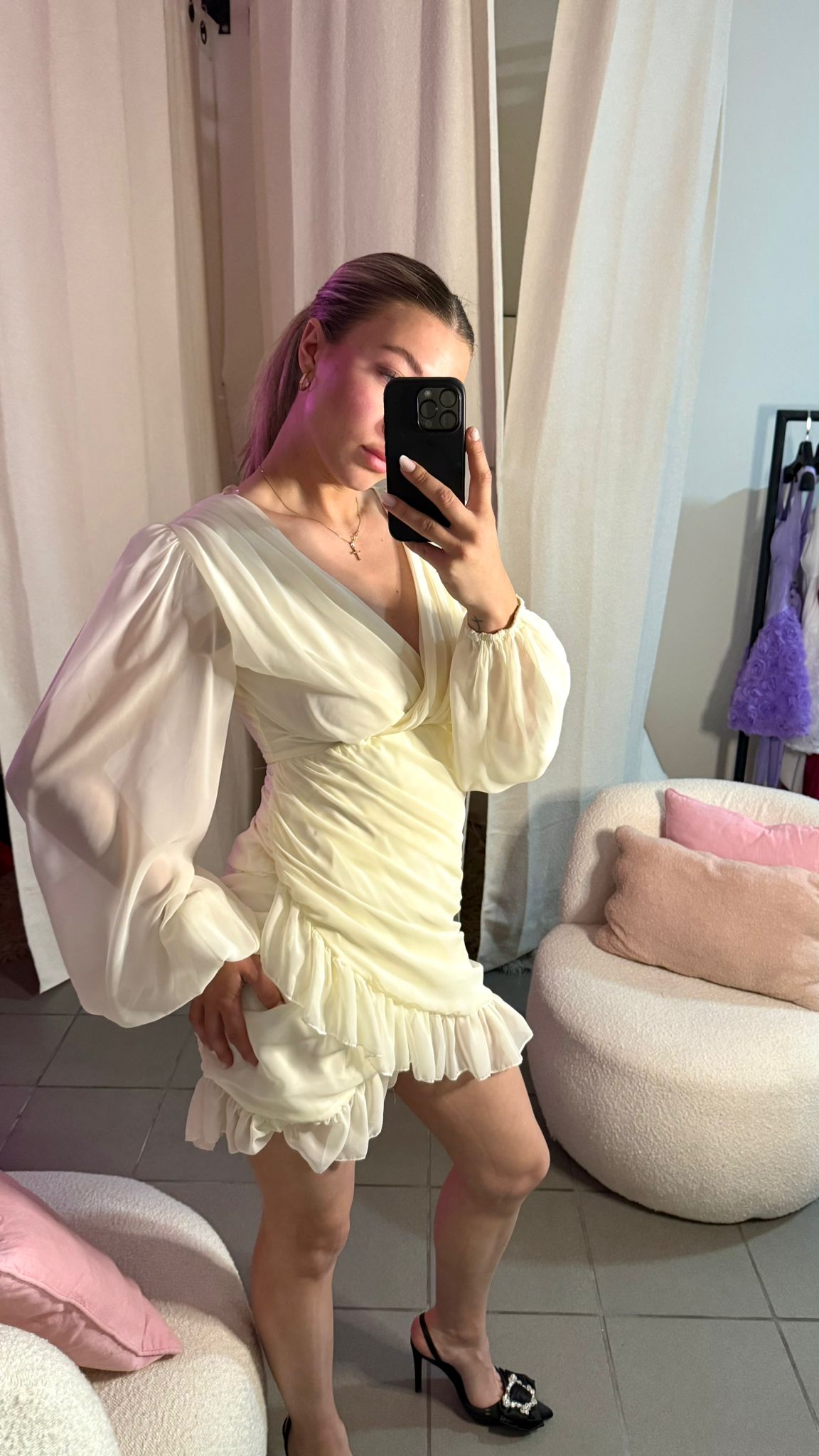 Această rochie elegantă albă este alegerea perfectă pentru evenimentele speciale. Cu o croială tip wrap ce evidențiază talia și volane delicate la tiv, rochia aduce o notă feminină și sofisticată.