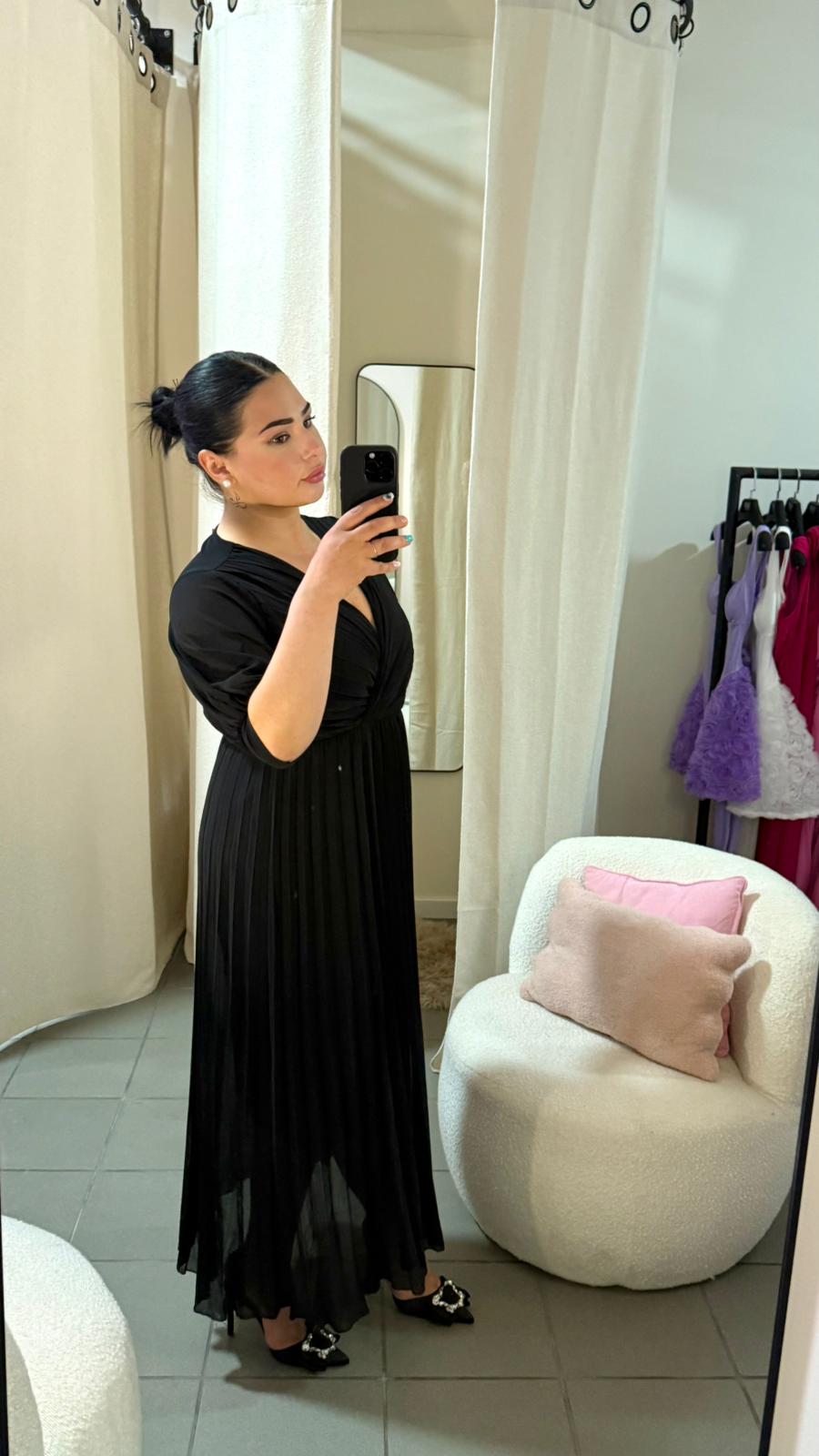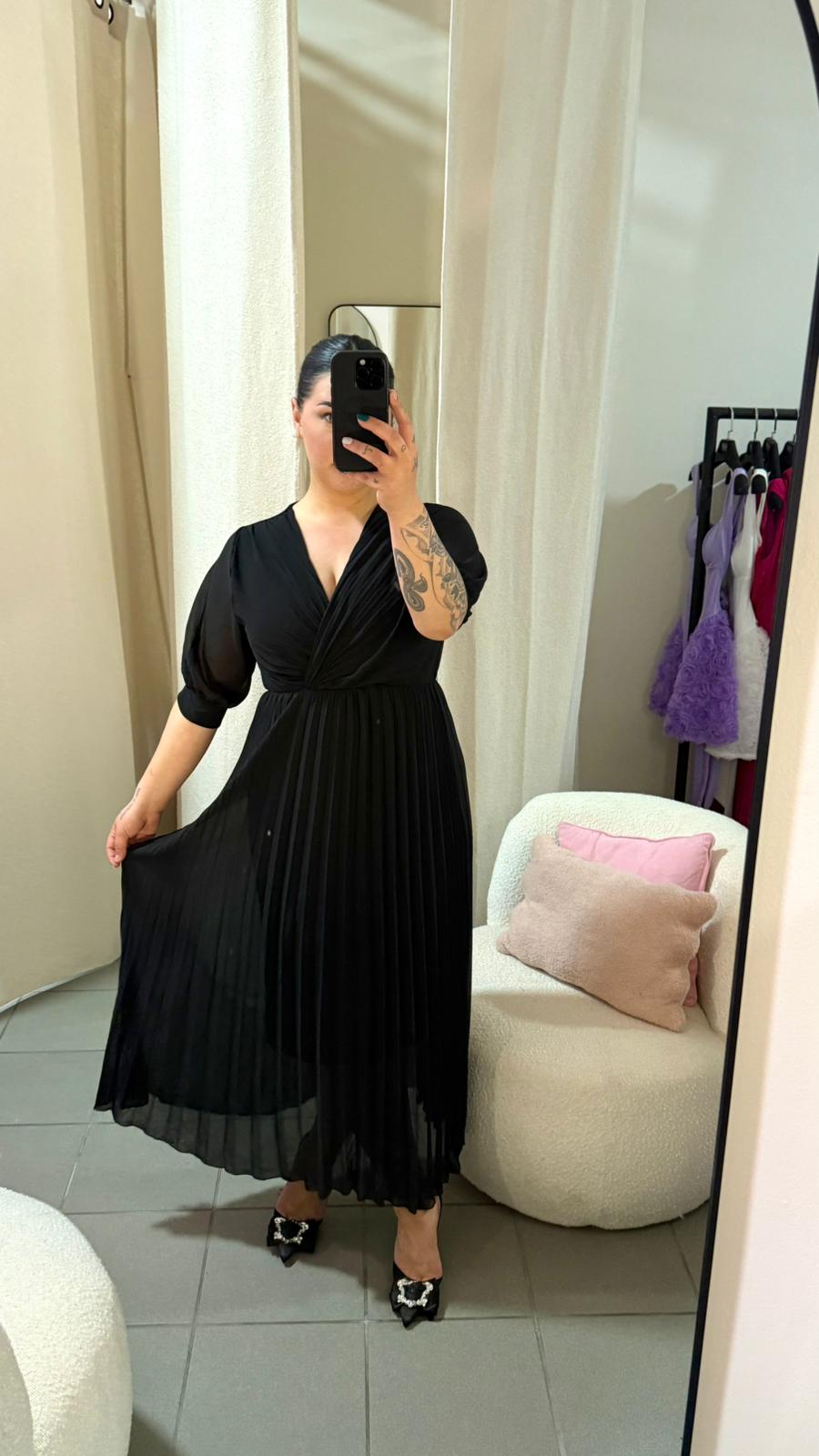 Această rochie midi neagră, cu decolteu petrecut și fustă plisată, este alegerea perfectă pentru ocazii speciale sau seri elegante. Datorită croiului lejer și materialului vaporos, avantajează orice siluetă și oferă o alură sofisticată cu minim de efort.
