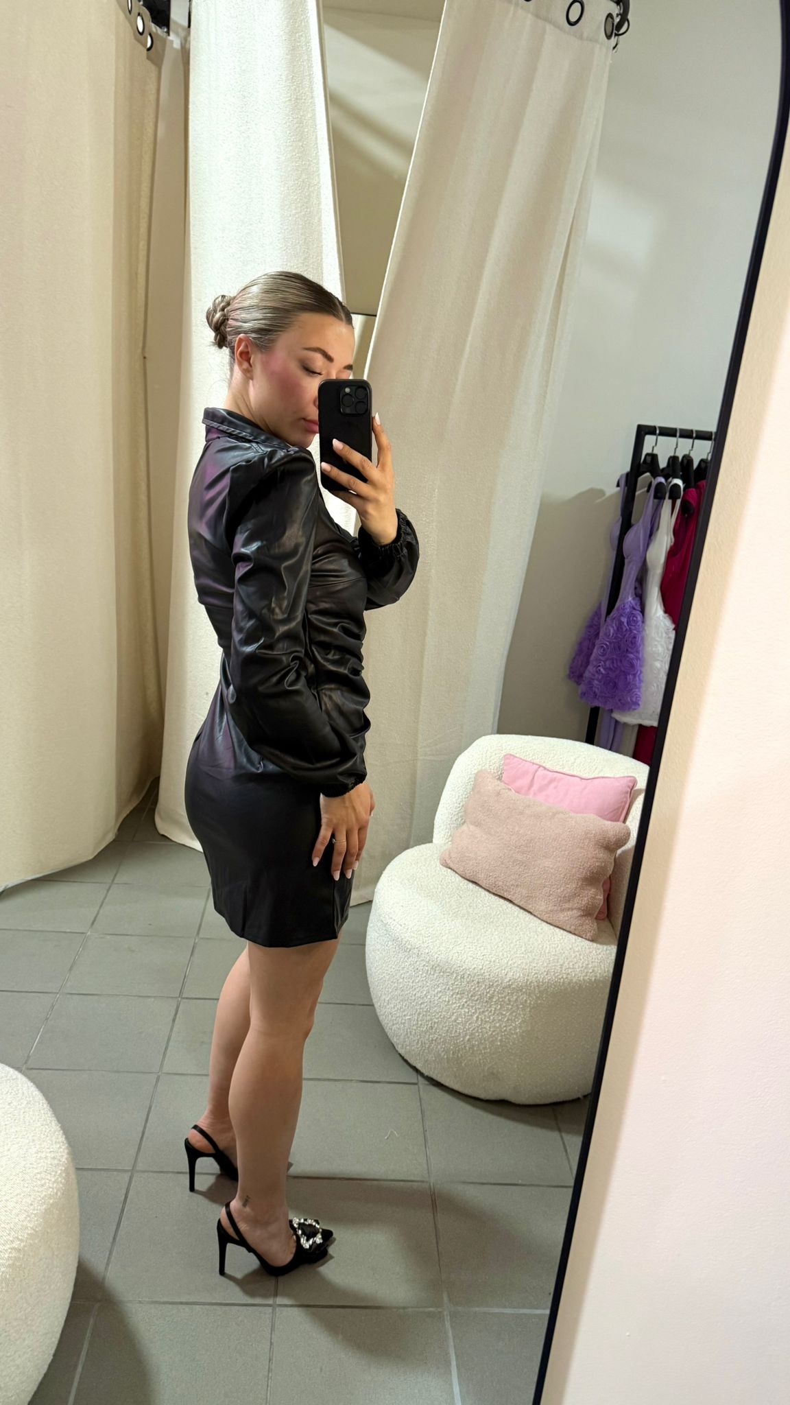 Această rochie mini neagră, cu aspect de piele, îmbină senzualitatea cu rafinamentul. Cu o croială cambrată, mâneci lungi și fronseuri strategice, pune în valoare silueta și adaugă un vibe puternic, perfect pentru o apariție de impact.