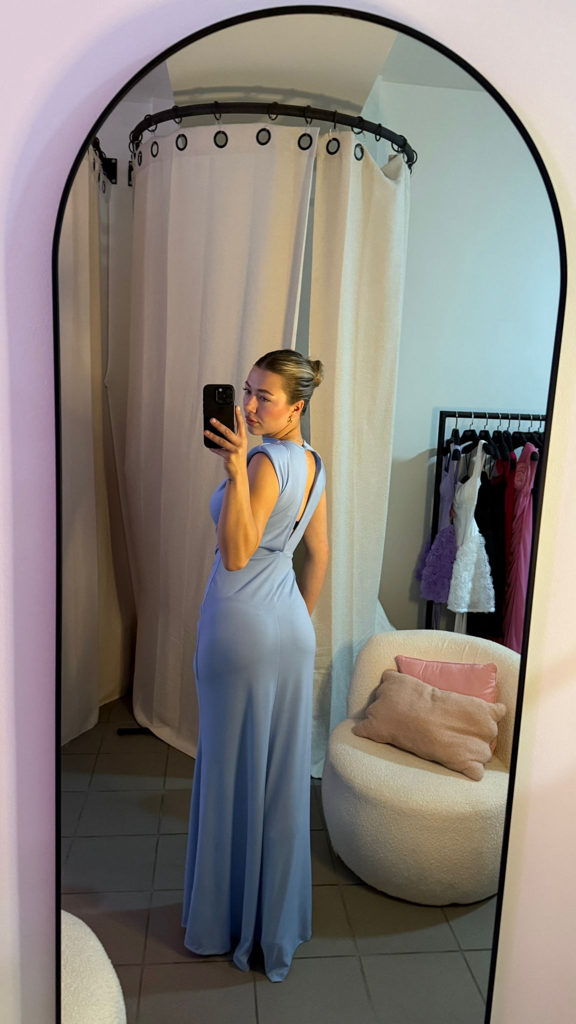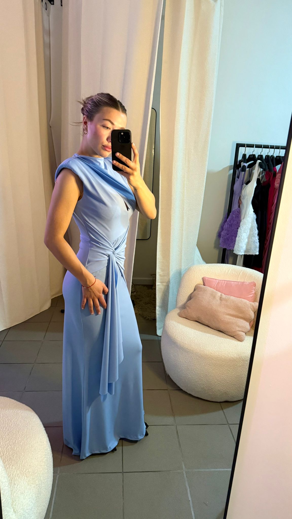 Această rochie lungă bleu impresionează prin croiala elegantă și detaliile rafinate. Drapajul frontal accentuează talia și creează o siluetă armonioasă, în timp ce croiala lejeră pe picior adaugă fluiditate fiecărui pas.