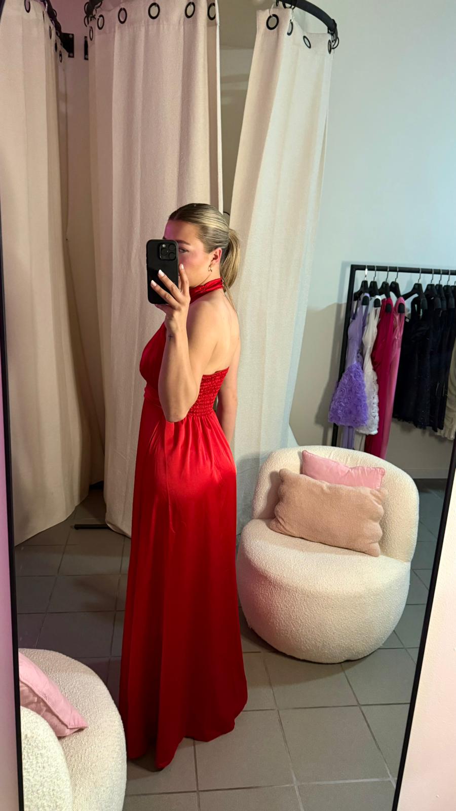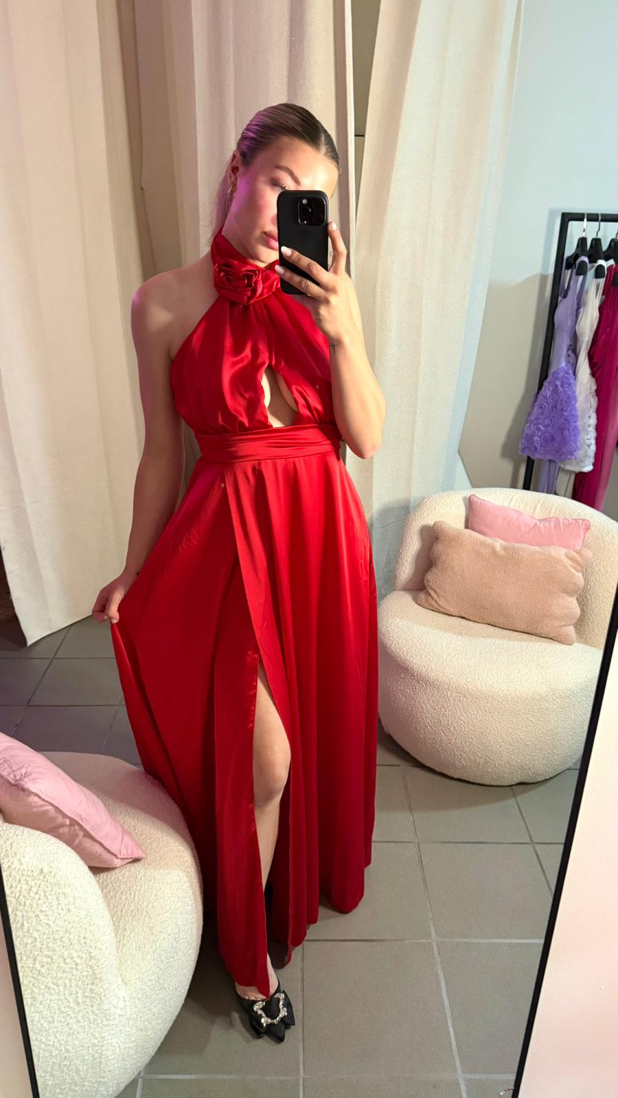 O rochie de seară seducătoare din satin roșu intens, perfectă pentru ocazii speciale. Gulerul tip halter cu aplicație florală și decupajul rafinat la nivelul bustului adaugă un aer romantic și elegant. Spatele elastic oferă confort și se mulează perfect pe siluetă. Fanta frontală conferă un plus de feminitate și rafinament.