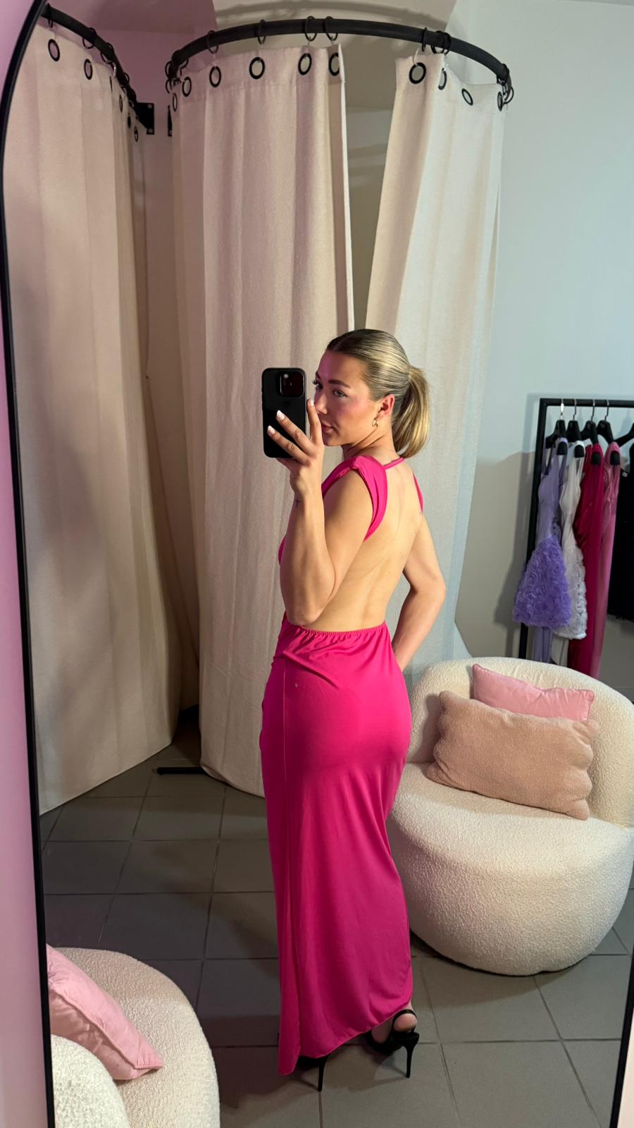 Această rochie lungă într-o nuanță vibrantă de roz fucsia îți oferă o apariție spectaculoasă și feminină. Decolteul adânc, talia frumos accentuată prin drapaj și decupajele laterale adaugă un plus de senzualitate, în timp ce spatele gol transformă orice intrare într-un moment memorabil.