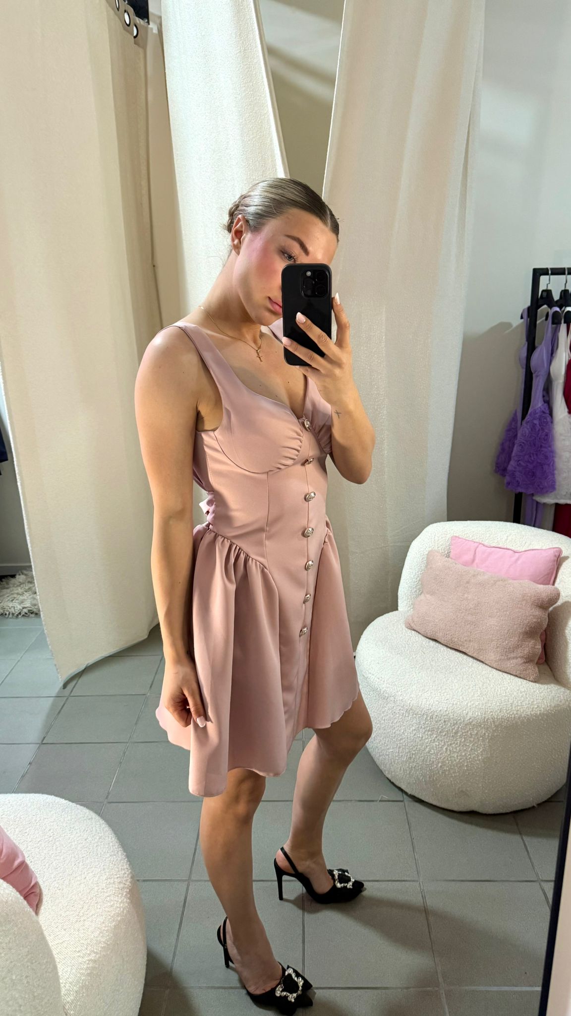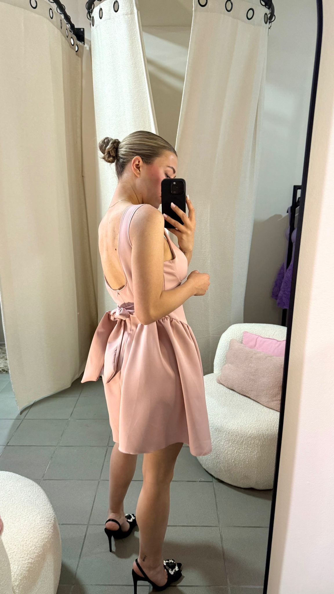 Această rochie scurtă roz pudrat este definiția grației feminine. Cu un croi care accentuează talia, cupe ușor drapate și nasturi decorativi pe față, oferă un look sofisticat și rafinat. Spatele decupat cu fundă adaugă o notă romantică și modernă în același timp – perfectă pentru o zi specială, un eveniment sau o ieșire stylish în oraș.