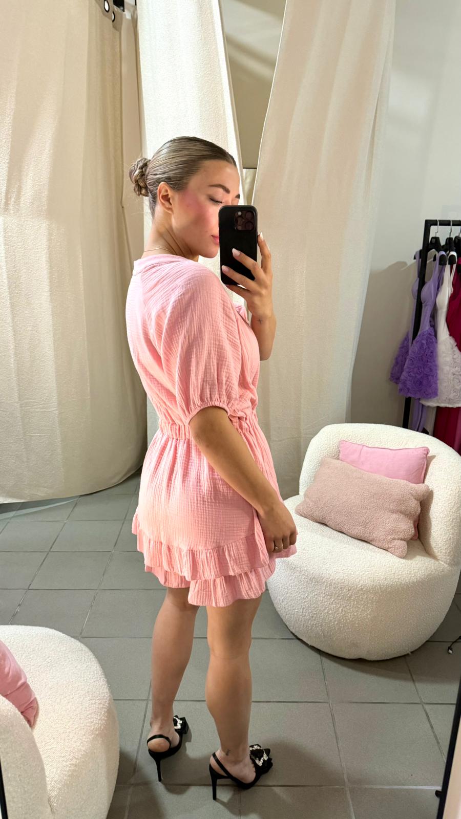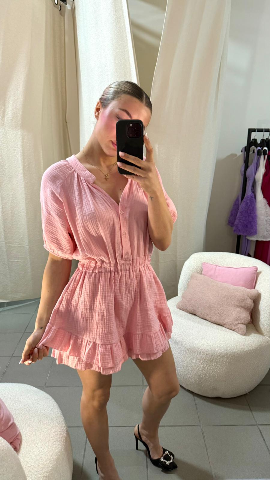 Această rochie salopetă adorabilă este alegerea perfectă pentru zilele însorite în oraș, la plajă sau la festival. Realizată din bumbac 100% moale și respirabil, cu mâneci scurte bufante, talie elastică și volane jucăușe la tiv, îți oferă un look lejer, feminin și fresh.