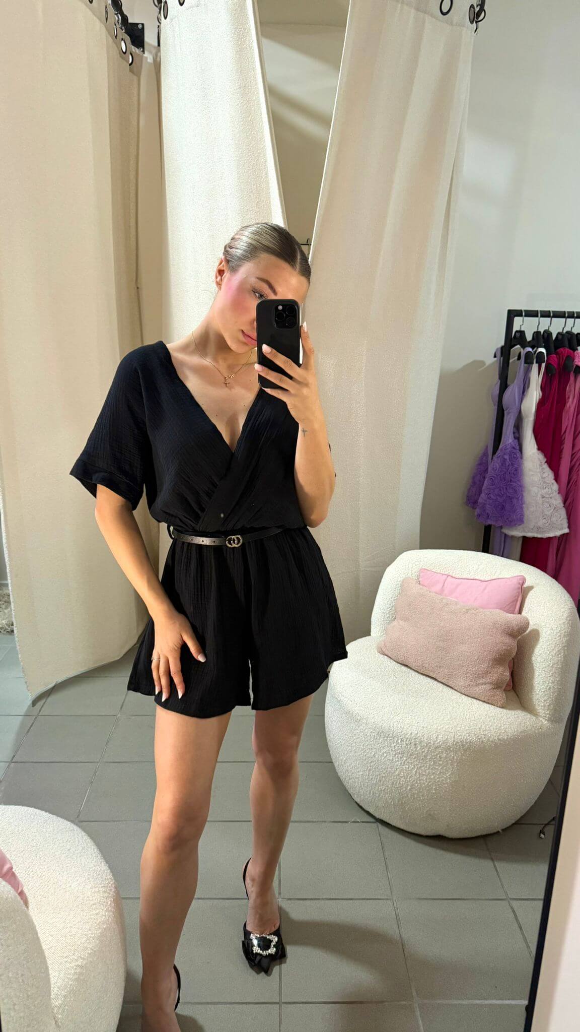 Această salopetă neagră din bumbac combină confortul cu un design feminin și modern. Croiala vaporoasă este completată de volane delicate și o talie accentuată cu o curea tip piele care adaugă un contrast elegant. Ideală pentru zilele de vară, ieșiri în oraș sau vacanțe – o piesă versatilă și chic.
