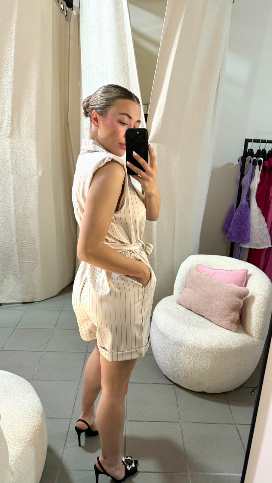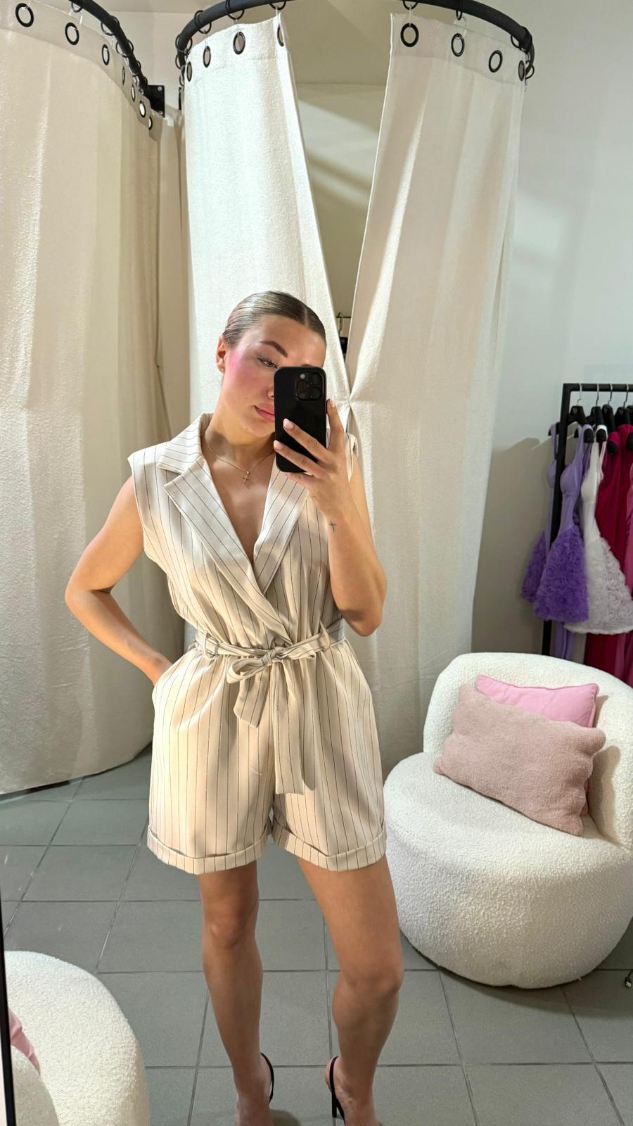 Această salopetă scurtă elegantă aduce un vibe business-casual cu un twist modern. Cu un croi fără mâneci, rever tip sacou și cordon în talie, această piesă oferă o siluetă feminină și rafinată. Materialul cu dungi fine verticale creează un efect optic de alungire, iar pantalonii scurți rulați adaugă un aer cool și urban.