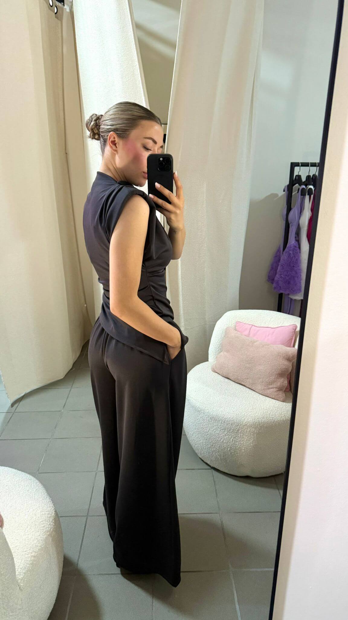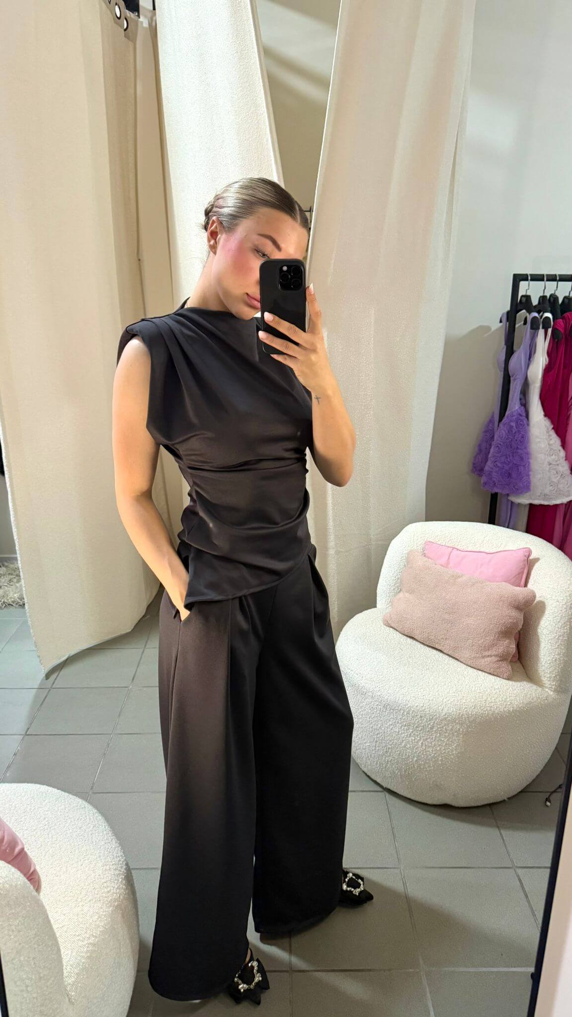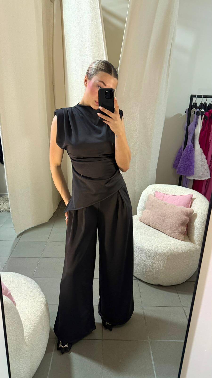 Acest set elegant format din top și pantaloni largi impresionează prin croiul fluid și materialul care cade impecabil pe corp. Topul asimetric adaugă un efect sofisticat și flatant, în timp ce pantalonii evazați oferă confort și stil.