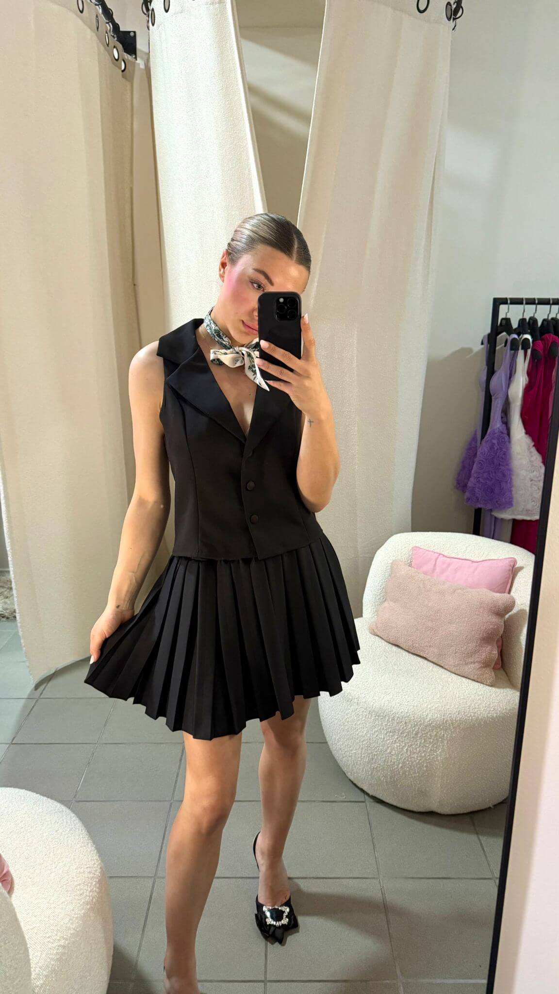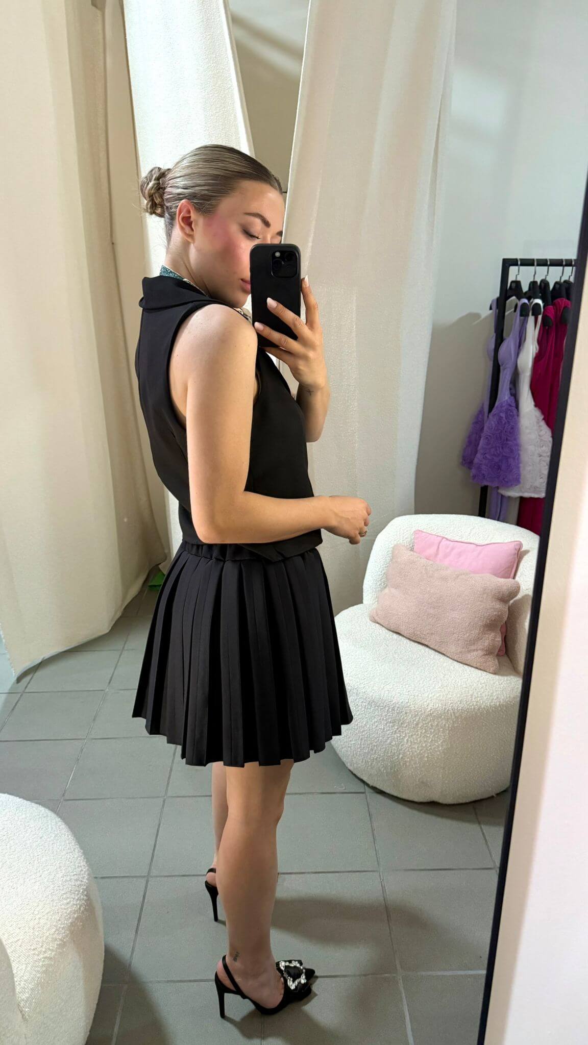Acest set negru compus din vestă tip blazer fără mâneci și fustă plisată mini este un must-have în garderoba oricărei fashioniste. Elegant, dar playful, perfect pentru o zi în oraș, o întâlnire stylish sau chiar un eveniment casual-chic.